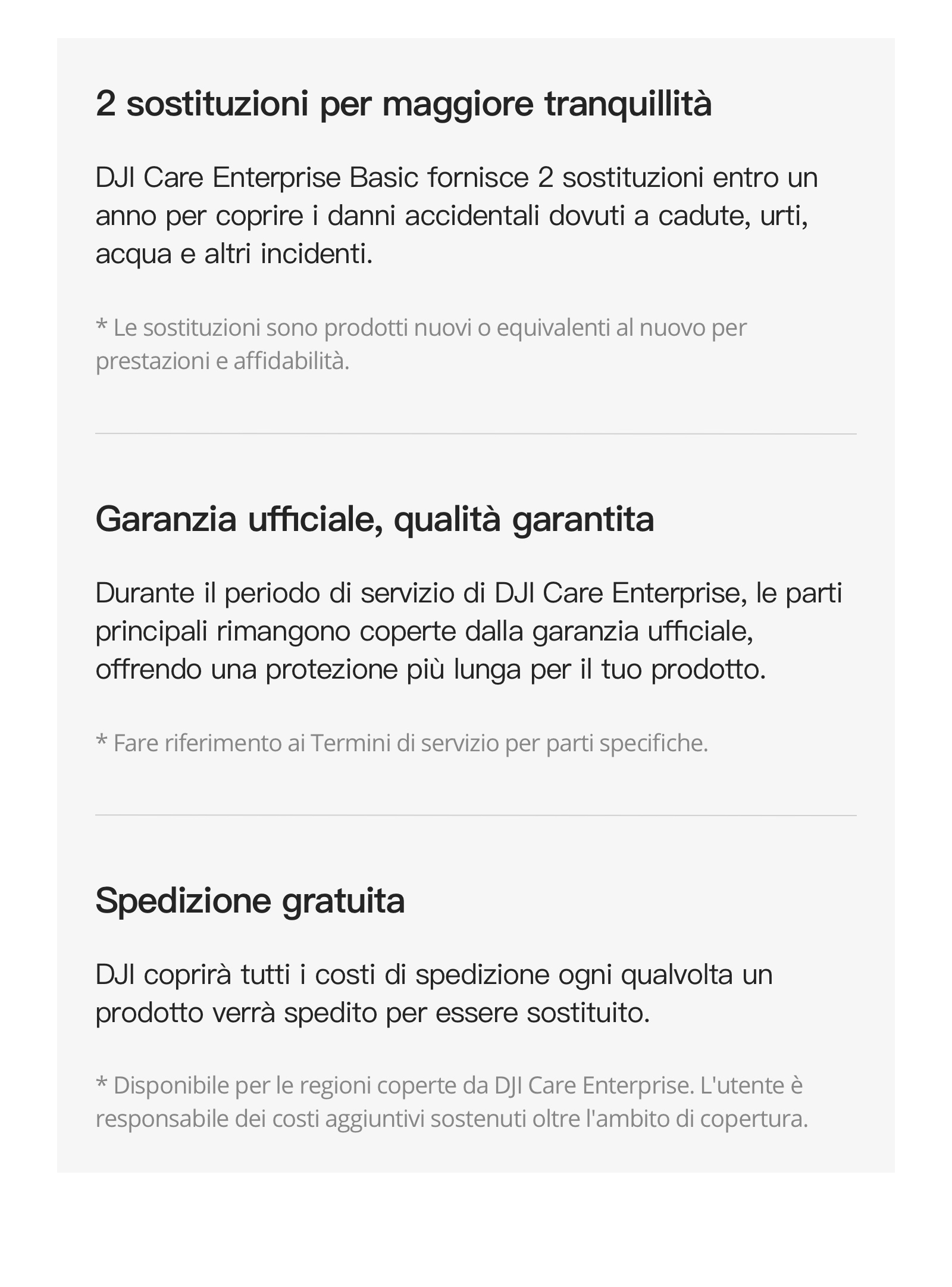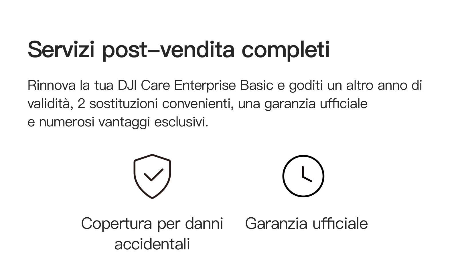 Assicurazione DJI Enterprise Shield Plus contro le rotture con copertura illimitata per 1 anno.L’attivazione viene effettuata dal dealer fornendo il seriale del drone.L’attivazione potrebbe impiegare fino a 5gg lavorativi.Il servizio può essere associato solo con drone non attivo, in caso di attivazione prima dell’associazione non sarà più attivabile ne...